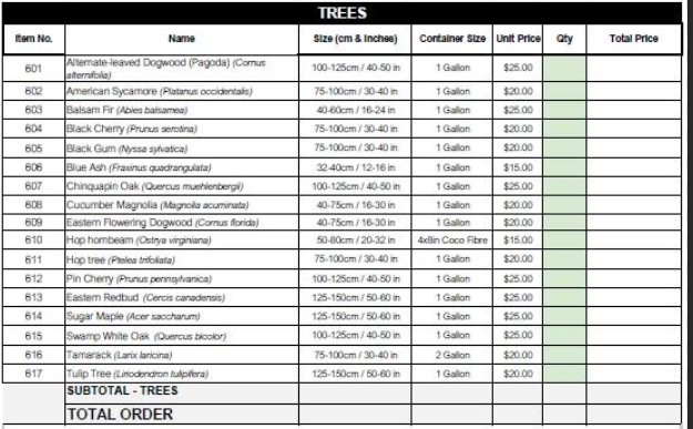 After choosing your plants, ensure you or a friend can pick them up on May 30th. Send your order and payment to leamingtonhorticulturalsociety@gmail.com. Bring your form to the Leamington Horticultural Society Plant Sale, check in to receive your order number, then use a wagon to collect your plants. The trees are easy to transport and fit in most cars or SUVs. There will also be a variety of native perennials for sale that day so make sure you bring the list of what you’re looking for!