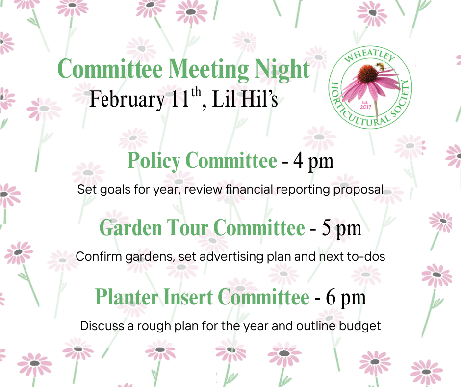 Through the cold and snowy months, gardeners are planning.  Your Horticultural Society is planning too!  We do some of our planning at our monthly meetings, but some happens at separate committee meetings that focus on specific projects.  Our committees are open to all members and provide a way to make a big impact without a year-long commitment.